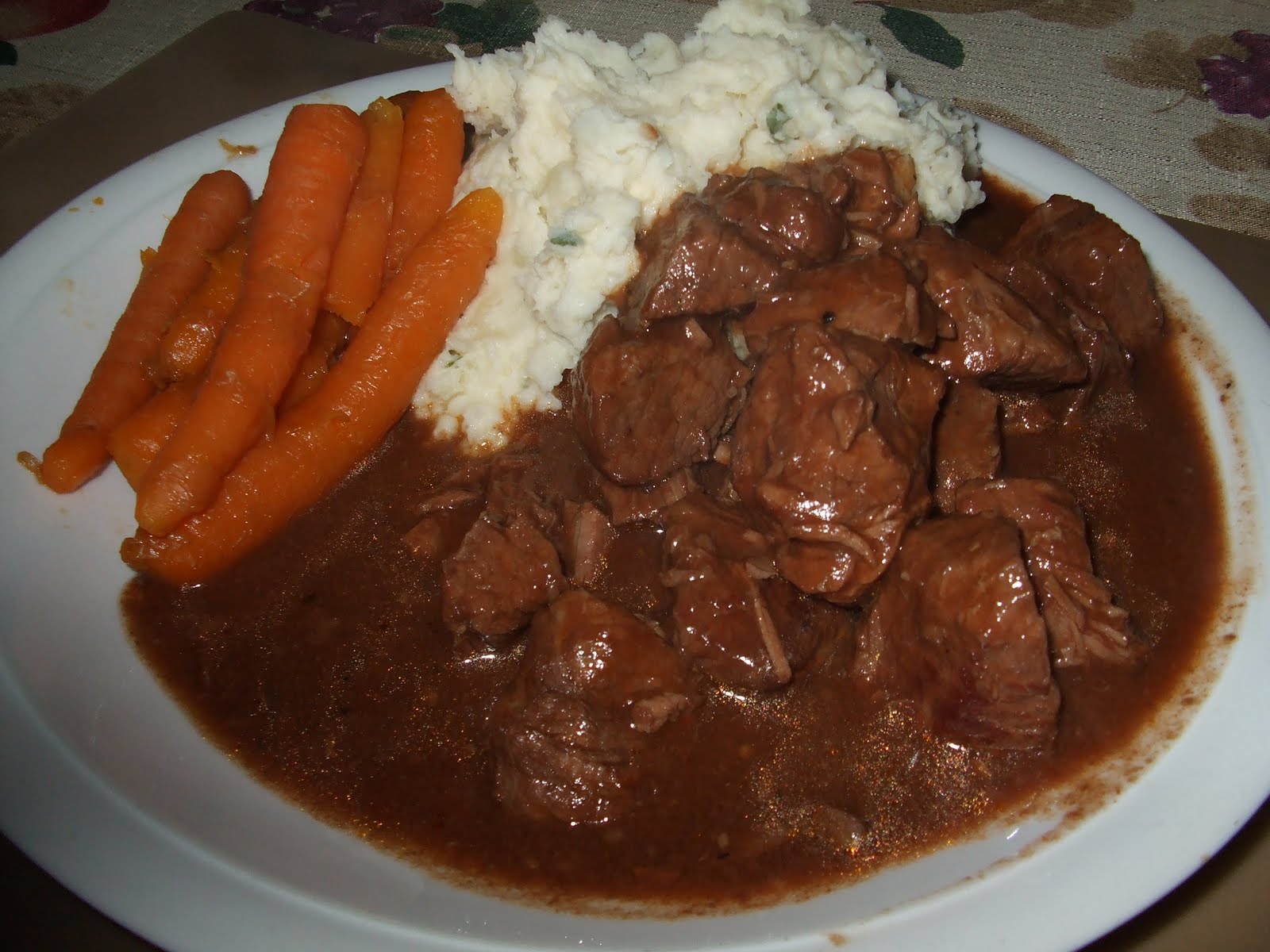 Temps total 8 h 5 min. Type de plat Plat principal. Cuisine Canadienne. Portions 4 à 6 portions. Ingrédients. 2 lb de cubes de bœuf. ½ tasse de bouillon de bœuf.