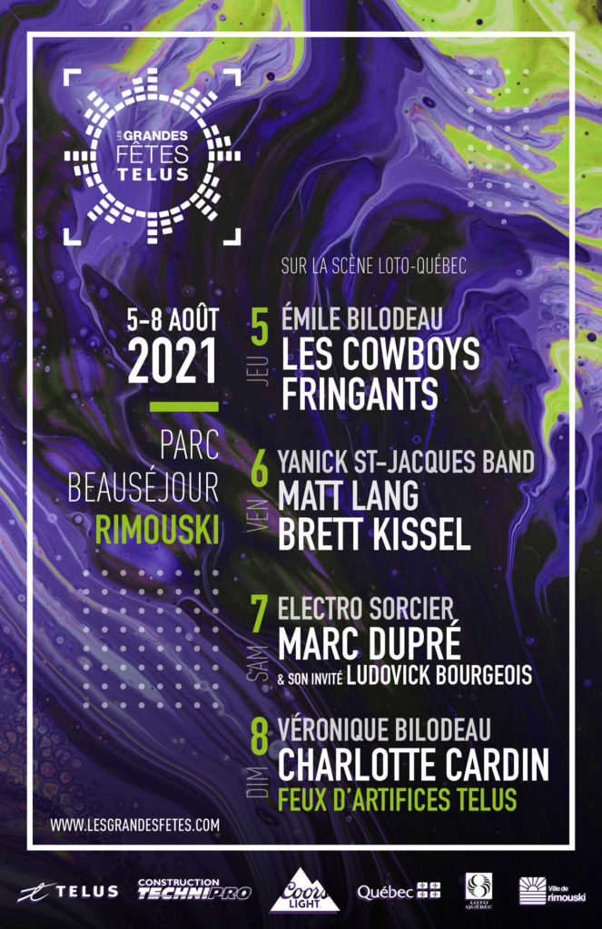 FESTIVAL. Les Grandes Fêtes TELUS se tiendront du 3 au 6 août. La programmation des Grandes Fêtes TELUS est maintenant connue. Les Cowboys Fringants, Five Finger Death Punch, Charlotte Cardin et Lost Frequencies sont les têtes d'affiche de l'événement. Le festival aura lieu au parc Beauséjour de Rimouski du 3 au 6 août.