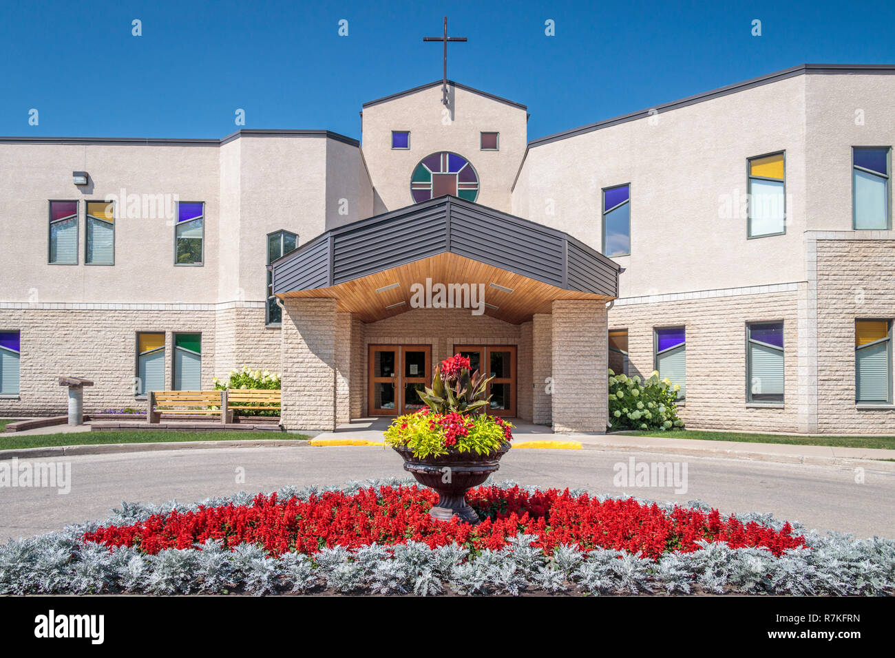 The east entrance of the Winkler Bergthaler Mennonite church, Winkler, Manitoba, Canada Stock